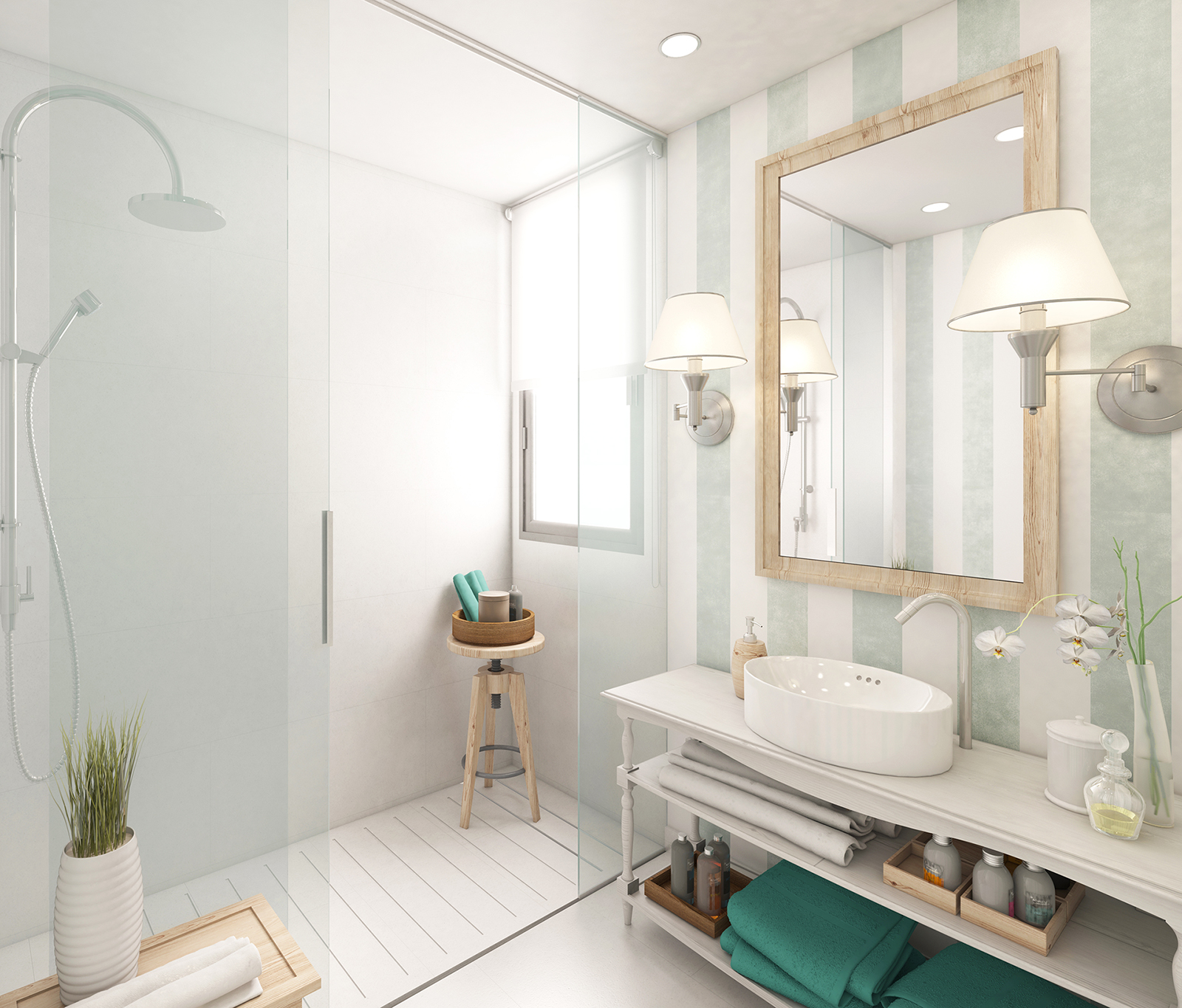Todas las griferías serán tipo monomando, con acabado cromado, y como accesorio adicional se entregan los espejos de los bajos colocados. Mamparas de baño opcional.