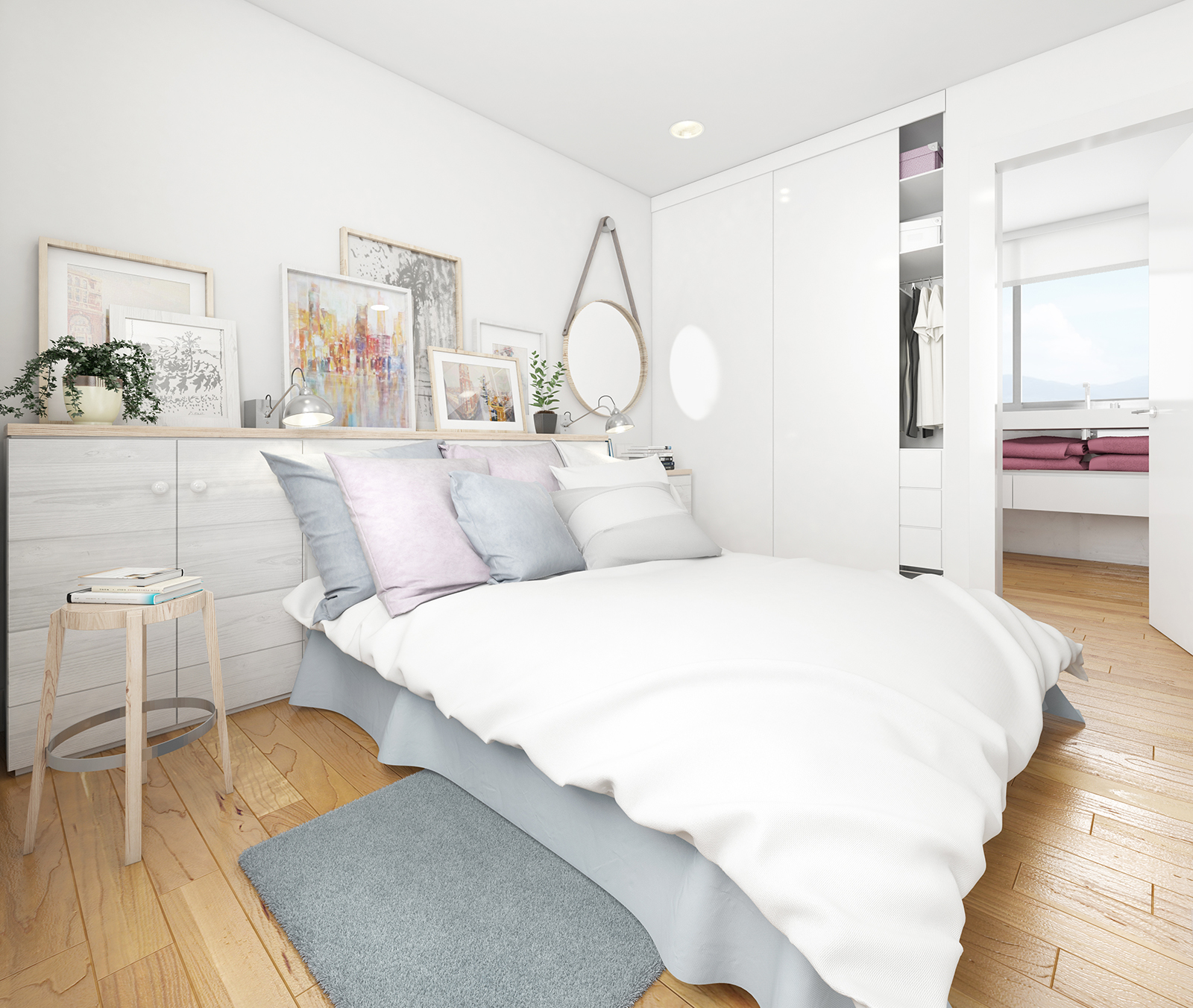 Muebles bajos y altos de gran capacidad de almacenamiento con acabado laminado o lacado de alta presión y herrajes con freno en cajones y gavetas.