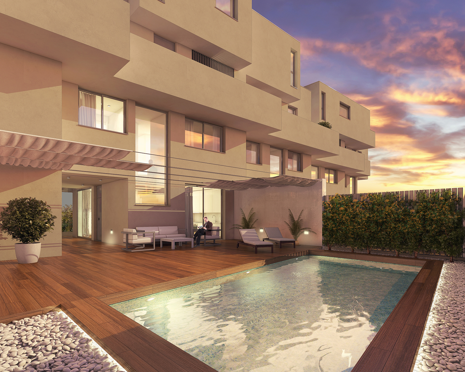 Los dúplex y apartamentos en planta baja dispondrán de piscina privada, además de la piscina comunitaria. EL vaso se hará a medida de hormigón gunitado y con las paredes acabadas en gresite. Iluminación con focos subacuática.